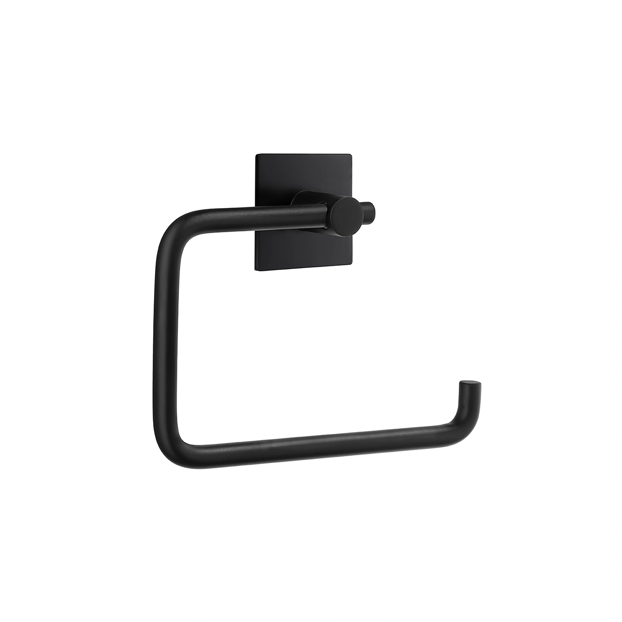 Stylish self-adhesive Toilet roll holder in stylish matt black from Beslagsboden, which has a Scandinavian design with a rectangular back plate. The Toilet roll holder is made from stainless steel and has a matte black surface.