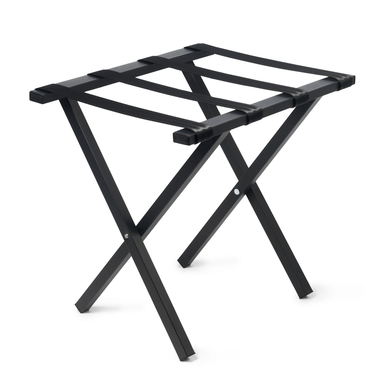 Luggage rack/stand Edward, black. A stylish interior detail as well as practical. A must in the hotel room for guests. Perfect storage for bags and suitcases. Made of matt black powder coated metal with durable black straps. H51 x D43 x W56 cm (unfolded), H56 x D19 x W56 cm (folded)