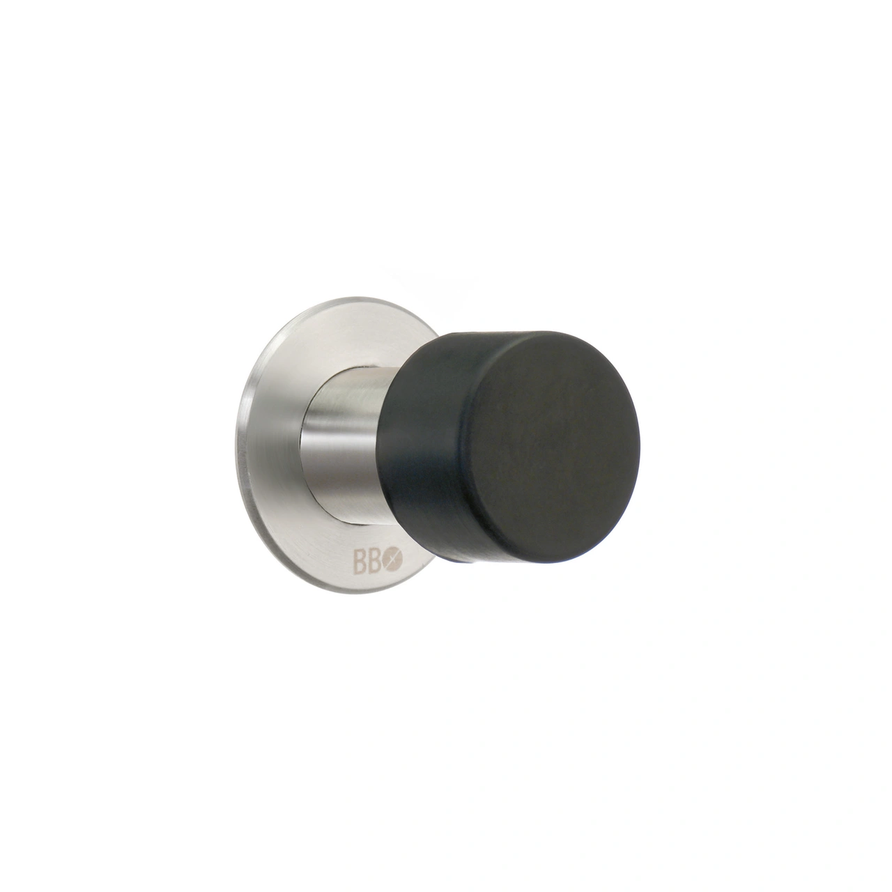 Practical and stylish black self-adhesive door stop from Beslagsboden for wall mounting. The door stop is made from stainless steel with a brushed surface and black rubber that protects both door and wall from unsightly marks.