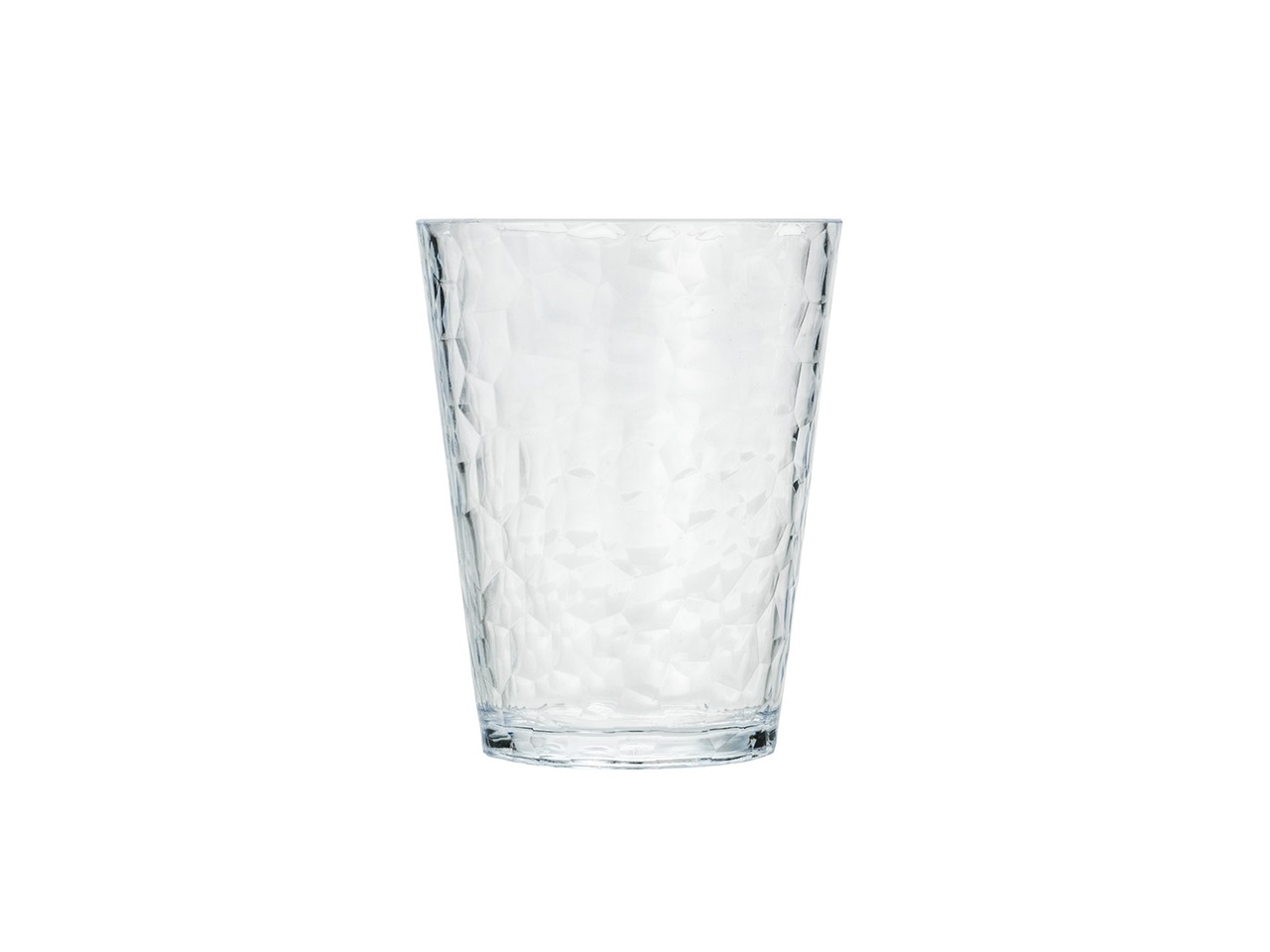 Klart snyggt vattenglas i hamrad PS plast. Glaset är tunnväggigt, okrossbart och värmetåligt för både diskmaskin och varma drycker. Passar perfekt till spa, hotellrum, poolområde mm där man inte vill ha glas. PS är även återvinningsbart. Värmetåligt upp till 80 grader.